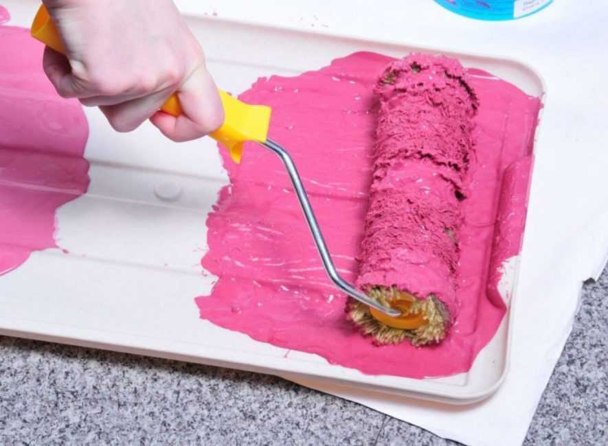 - Краску перемешивают при помощи миксера, наливают некоторое количество в лоток, обмакивают валик и наносят первый слой.