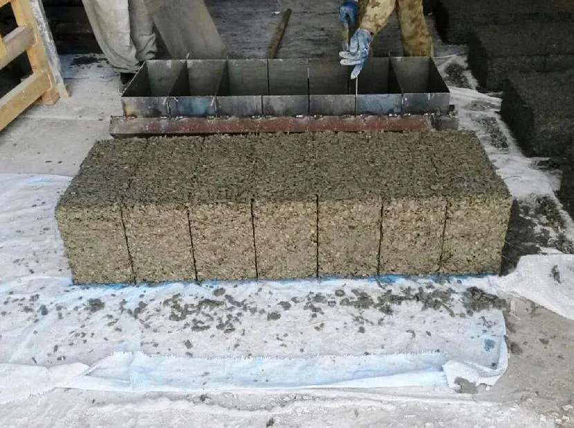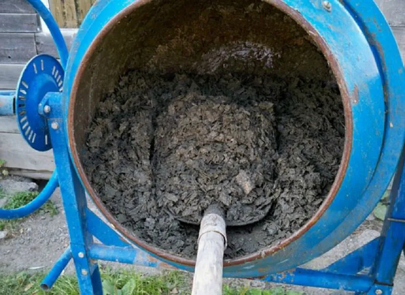 Первыми соединяют сухие ингредиенты для раствора, потом добавляют известь и древесные остатки. Аккуратно вливают воду (15-25 С) с растворенными химическими улучшителями. По объему жидкости не должно быть больше бетона, иначе пострадает прочность блоков.