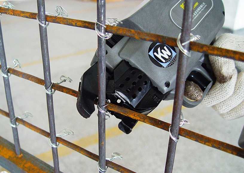 Упростить процесс вязки можно при помощи специального вязального пистолета. Его прислоняют к месту пересечения стальных прутов, нажимают на спусковой крючок – и соединение готово. В минуту можно выполнить до 40-50 таких операций. Минус – высокая цена оборудования и необходимость использовать дорогую проволоку.