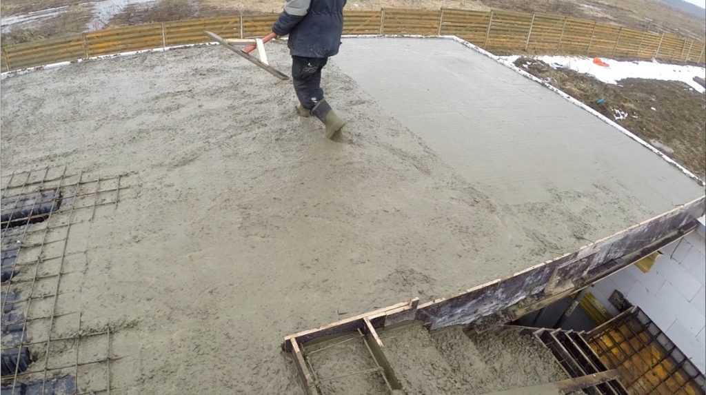 Желательно употреблять бетонный раствор заводского изготовления. В нем выдерживаются соотношения составляющих, в смесь включают присадки, делающие лучше показатели эксплуатационно-технических характеристик. Бетон подвергается надежному контролю и привозится на место строительства в объеме, достаточном для одноразовой заливки. Посредством бетонного насоса смесь распределяют непосредственно на все пространство панели. Погружной вибратор для бетонной смеси эффективно утрамбовывает раствор и пропорционально рассредоточивает его по опалубке. Параллельно осуществляется удаление пузырьков воздуха. По завершении заливки плоскость сглаживают специальной гладилкой на удлиненной ручке и припорашивают тонким покровом сухого цемента.