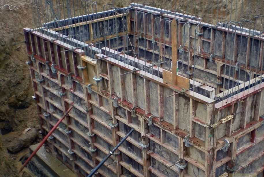 - Опалубка изготавливается из водозащищенной фанеры либо обработанных путем строгания досок. Стыки тщательным образом герметизируют. Для укрепления опалубки используются железные стойки раздвижного типа либо столбы из древесины диаметром до 20 сантиметров.