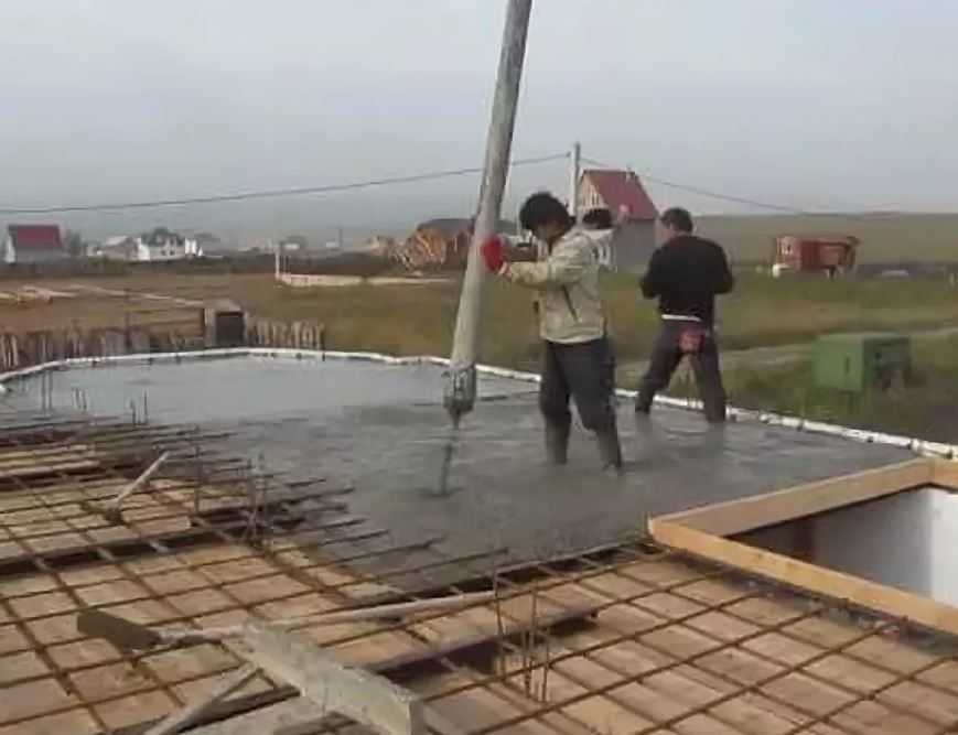 Создавая монолитную плиту лучше всего воспользоваться бетононасосом. Желательно во время заливки своевременно уплотнять бетон при помощи специального устройства — глубинного вибратора. Во время твердения бетону свойственен процесс усадки и появление микротрещин. В таком случае желательно легонько разбрызгивать воду над всей конструкцией.