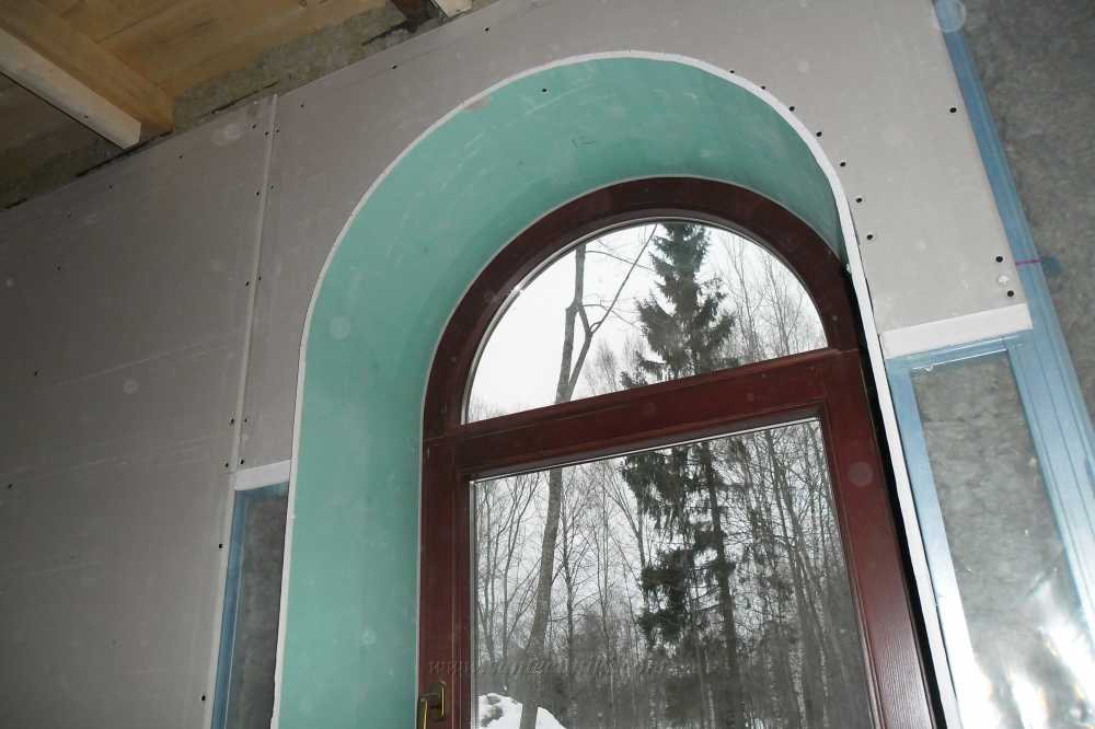 Простым способом оформления откосов арочного окна считается его отделка штукатуркой и гипсокартонным листом. Для осуществления этой процедуры вырезают шаблон из гипсокартона, который повторяет форму арки, и монтируют его в проём окна, а затем оштукатуривают.