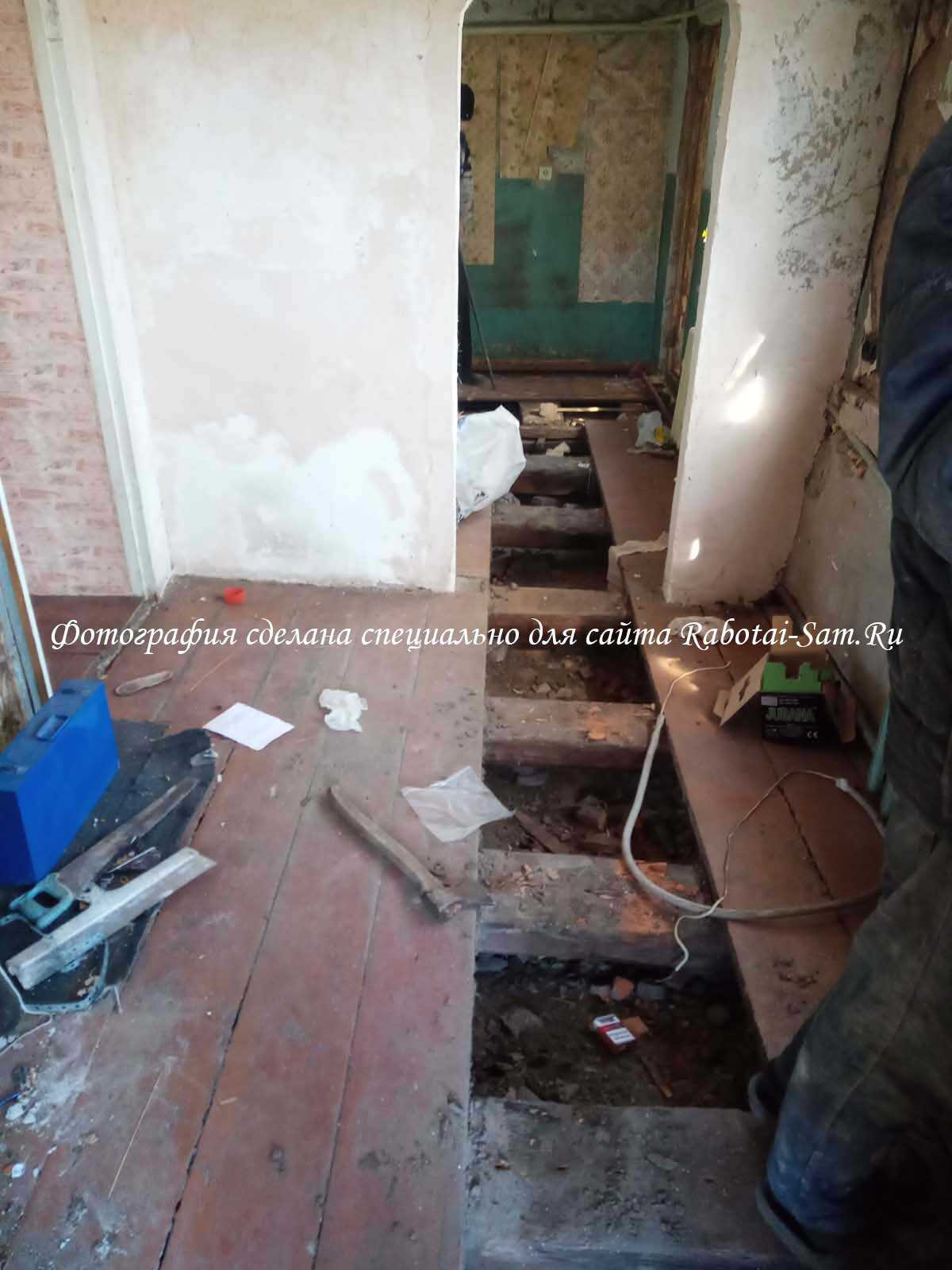 ШАГ 4: демонтаж деревянного пола. Теперь переходим к самому интересному, а именно к демонтажу деревянного перекрытия старого пола. Здесь придется изрядно попотеть, и лучше сразу пригласить напарника (а лучше двоих) для совместной работы