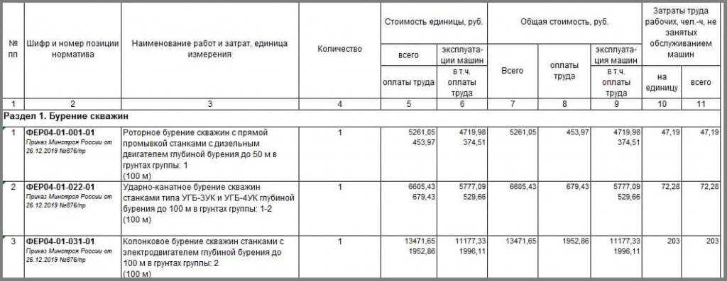 Таким образом, как можно заметить, пример сметы на бурение скважины на воду и других типов выработок может содержать разнообразные нормы в зависимости от исходных данных, указанный в проекте производства работ или других документах подобного рода. Однако в сборнике ФЕР04 существует множество других норм, необходимых при устройстве скважин разного типа.