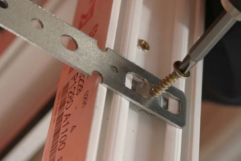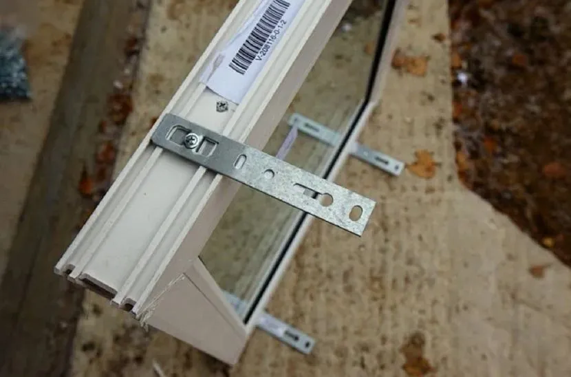 Монтажные детали крепят к раме крепежами, длиной 1,9 см и диаметром в 4,8 мм. От края проема до окна оставляют глубину в пределах 8-12 см. Если внешняя часть будет утепляться, то конструкцию ставят к наружной стороне на толщину утепляющего материала. В завершении установки анкерные пластины прикручивают саморезами с дюбелями к откосу. На каждую деталь по 2 элемента.