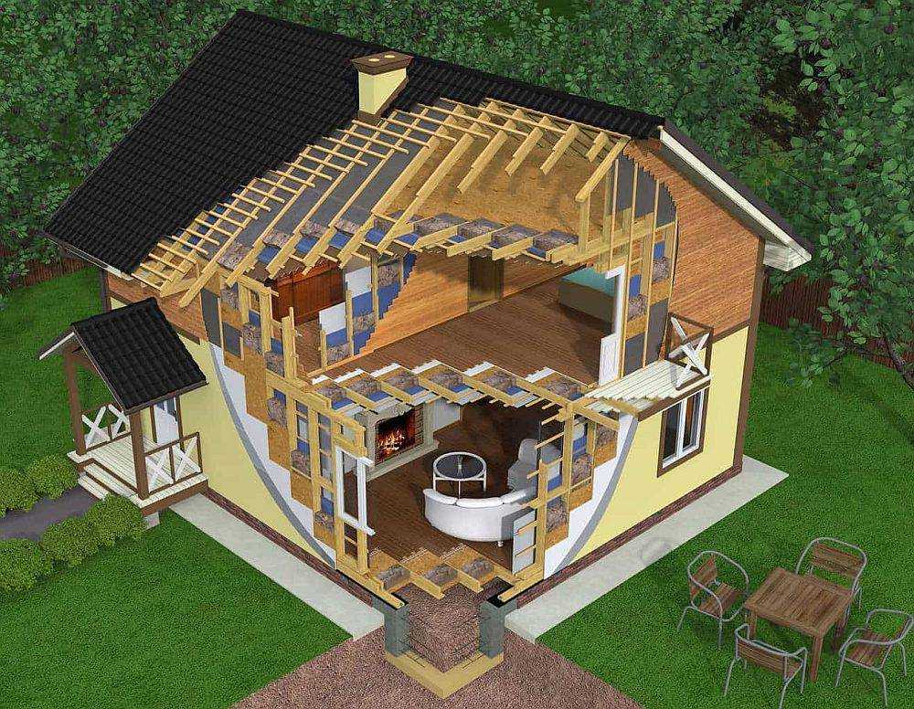 Когда же строится рамочный объект, сначала из досок и бревен уже на готовой основе создается каркас. Ставятся стропила для крыши. Потом этот каркас обшивается теплоизоляционными фрагментами. В конце достраивается верх.