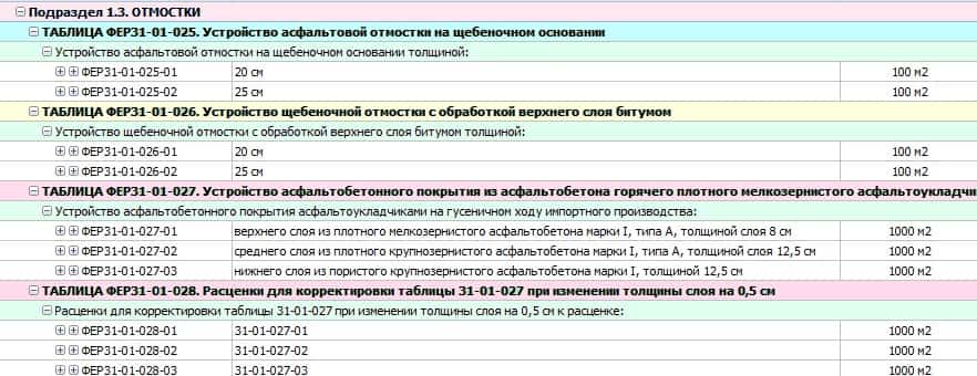 Для определения стоимости производства работ на аэродромах базами ФЕР и ГЭСН предусмотрен специальный отдельный сборник под номером 31. Если обратиться к рисунку 2, то можно увидеть, что в составе указанного сборника существует подраздел 1.3, в котором предусмотрено несколько таблиц, содержащих в своем составе расценки на отмостку из различных материалов.