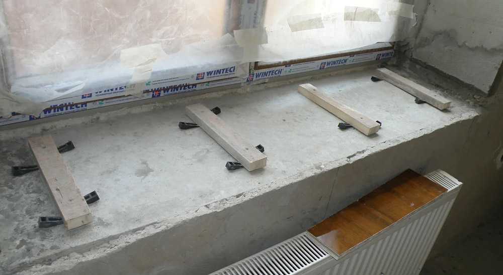 Под установленную оконную доску укладываются деревянные клинышки, начиная от краев и продвигаясь к середине. Такие подложки не должны выпирать за край стены, расстояние между соседними клинышками не должно превышать 40 см. Горизонтальность установленной подоконной конструкции проверяется по уровню и при необходимости исправляется дополнительной подкладкой деревянных клиньев.