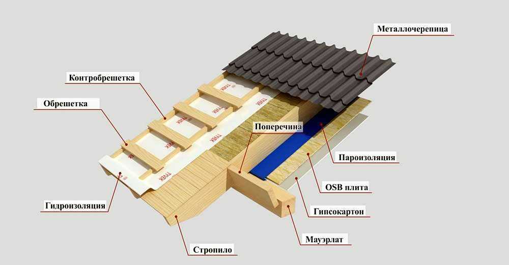 Обрешетка двухскатной крыши в простейшем случае представляет собой монтаж поперечных досок на стропила для укладки на нее кровельного материала. Но, как правило, современная кровля представляет собой более сложный пирог из различных слоев.