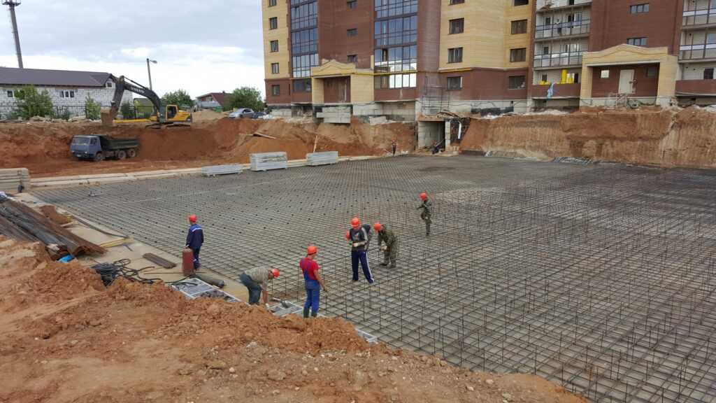 Вид применяемого фундамента зависит от грунта. К примеру, при возведении многоэтажного здания может потребоваться подсыпка песком или гравием. Основные работы на этой стадии — заливка бетона, способного выдержать высотное сооружение.