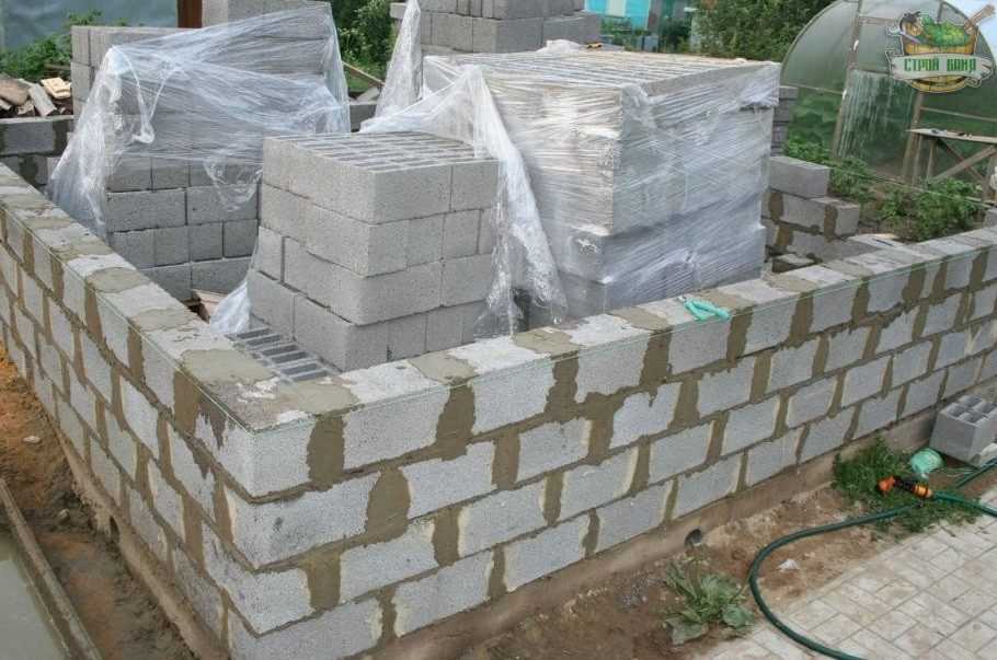 Из стеновых блоков выкладывают оставшуюся часть фундамента и всю постройку. Существуют разновидности изделий, имеющие вырезы по бокам. Они предназначены для улучшения стыковки элементов между собой.