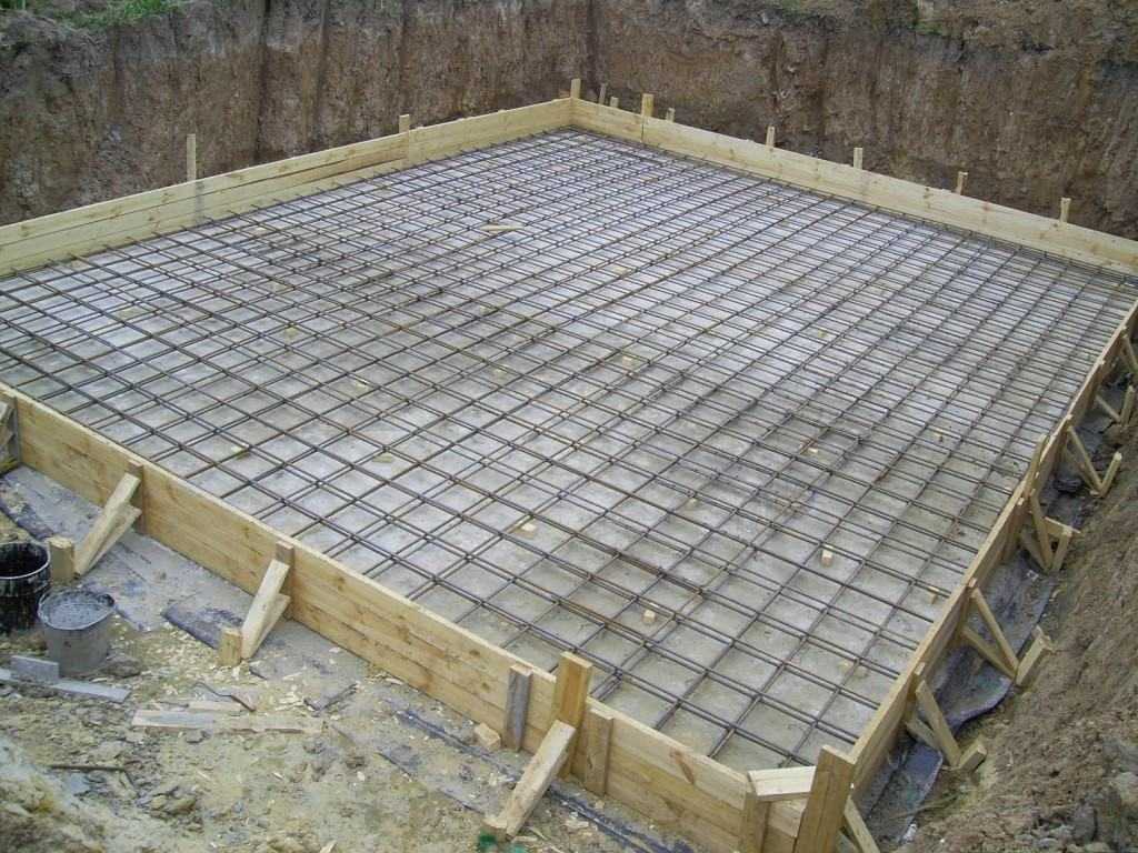 Затем на поверхность котлована укладывается слой щебёнки толщиной 10-12 см, поверх которого укладывают армирующую сетку из стальных прутьев с диаметром 6-8 см. Ширина ячейки армирующей сетки составляет 15-20 см.