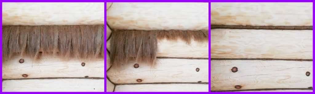- Остальная часть утеплителя забивается в крупные щели между бревнами. Утепленный шов должен иметь одинаковую толщину и выступать на 3 мм за края пазов.