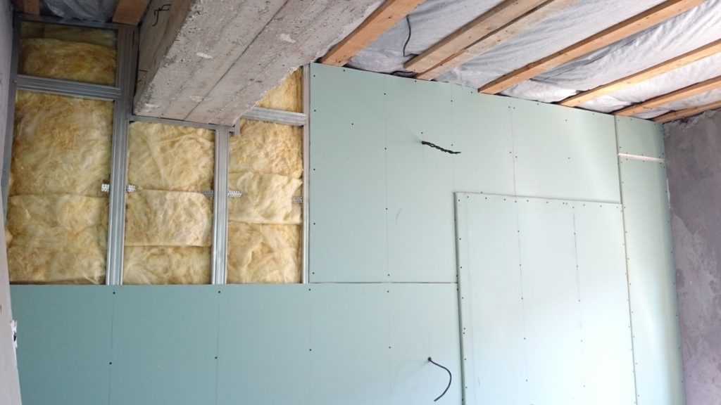 - В каркас перегородки обязательно укладывается слой звукоизолятора. Он доложен плотно занимать место между листами гипсократона;