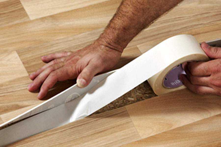 - К полу по линии стыка приклеивается скотч. Затем с него снимается верхняя защитная пленка и накрывается линолеумом.
