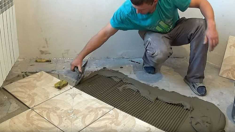 Рис. 14. Укладка плитки поверх чернового пола профессиональными рабочими