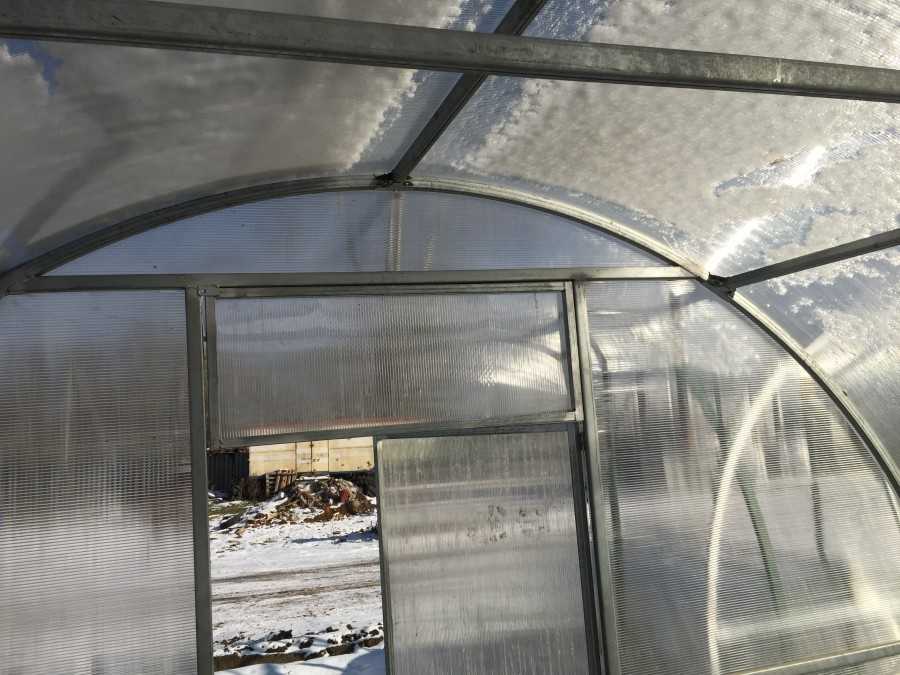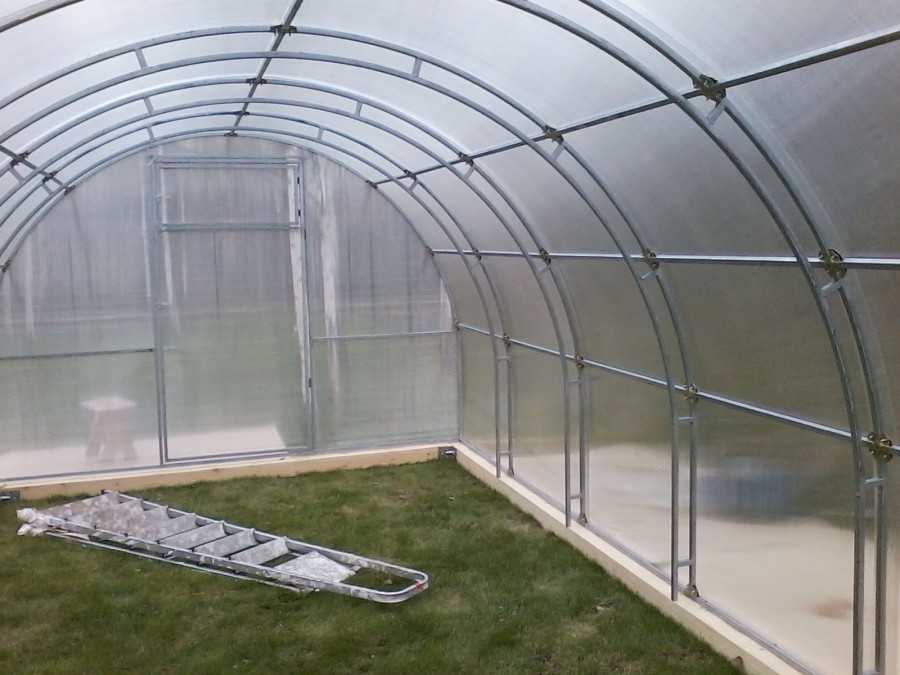 можно собрать часть конструкции на плоской горизонтальной площадке, затем поднять и установить. После установки двух стен теплицы установите и прогрунтуйте все поперечные трубы, замерьте, полностью затяните болты.