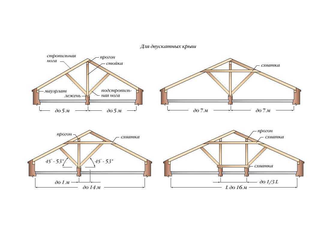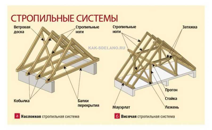 Количество бруса и досок для устройства стропил рассчитывается в соответствии со схемой каркаса. Сюда включены:
