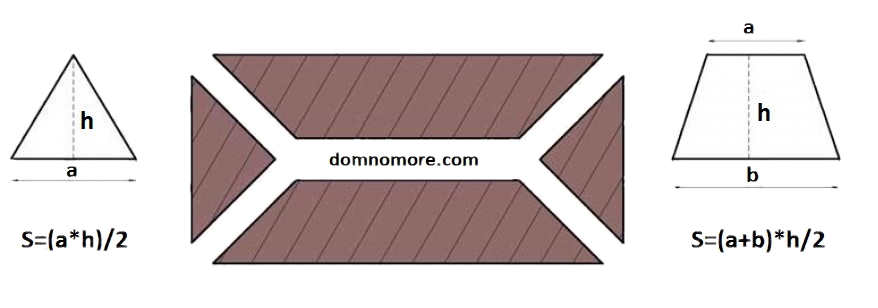 6. Площадь трапеции: высоту трапеции b умножить на длину основания (бокового карниза), разделить пополам.