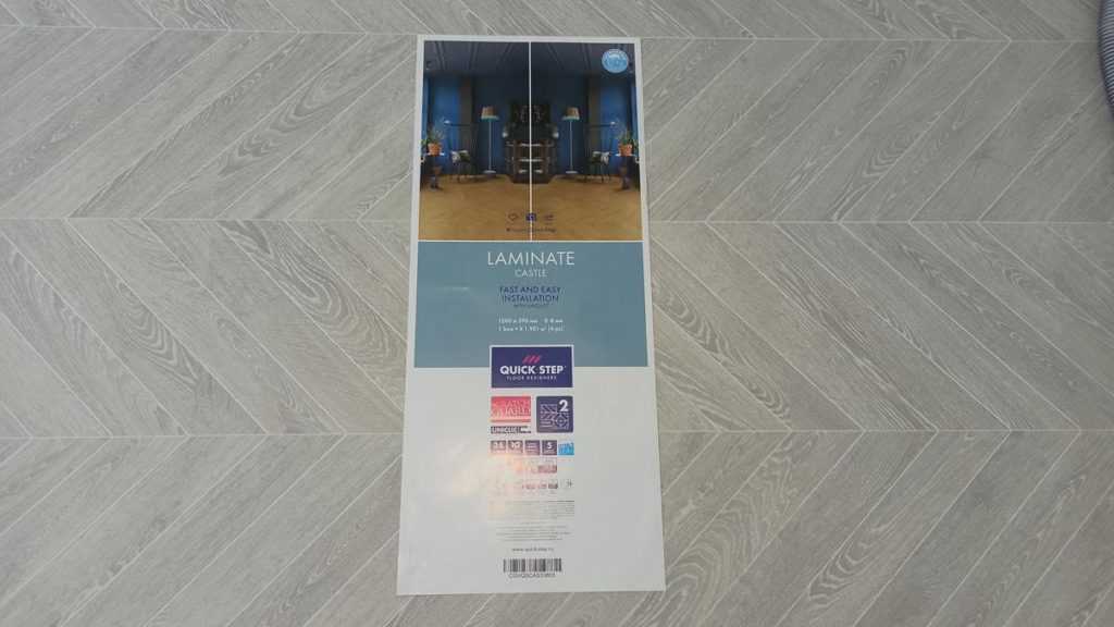 После полной подготовки двух помещений с обеспыливанием приступили к настилу Квик Степ Castle Дуб Светло-серый патина.