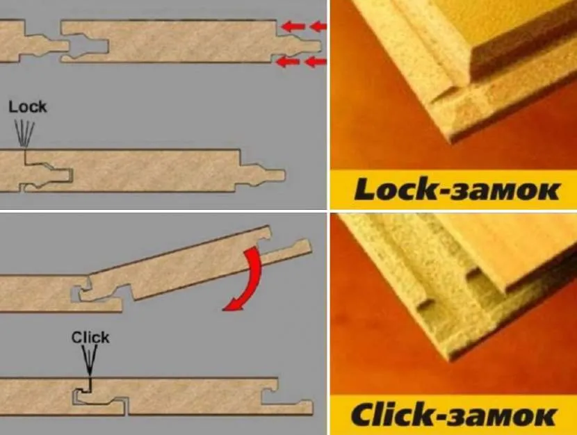Качество базовой плиты ламината оказывает прямое влияние на надежность замковых соединений. Но большое значение имеет и конструкция самого замка. Он бывает трех видов. Наиболее распространенными являются Lock, когда шип одной доски просто вставляется в паз другой, и Click, когда происходит защелкивание.