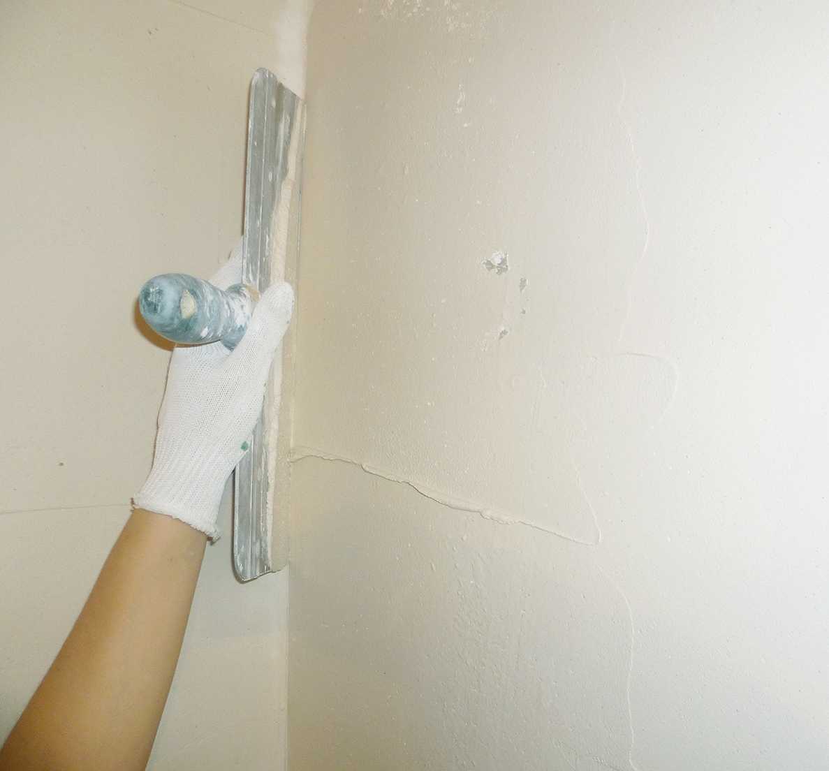 Сначала требуется понять кривизну стыка. Далее вдоль него наносят шпаклевку. Излишний состав снимается правилом. Ровность проверяют с помощью угольника и строительного уровня. Если обнаружатся отклонения, то стык опять промазывают штукатуркой, но меньшим слоем.