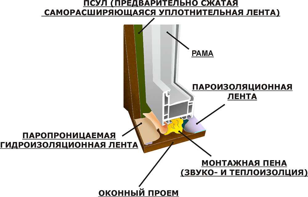 При монтаже важно заполнить пространство между проёмом и самой оконной рамой. Здесь используются такие слои