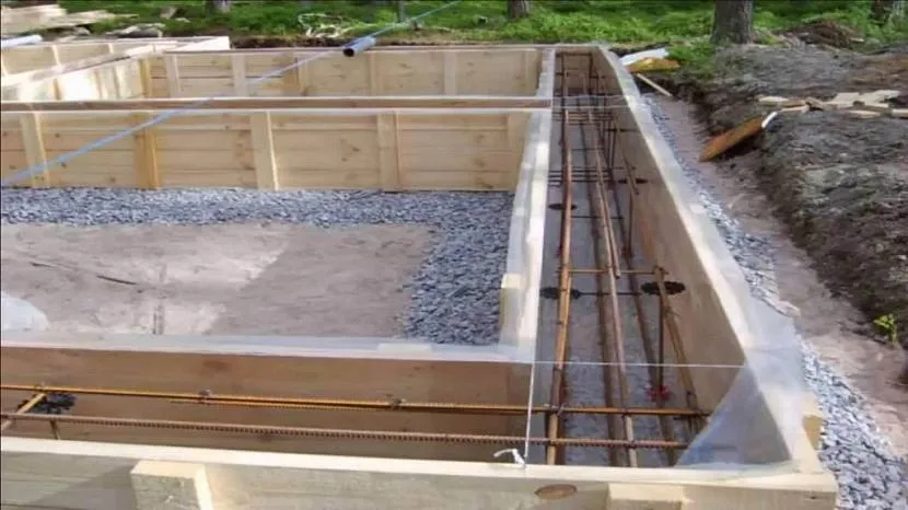 Сборка ленточного фундамента выполняется по периметру будущего строения с небольшим запасом (до 100-150 мм). В этом случае основанием могут служить различные материалы.