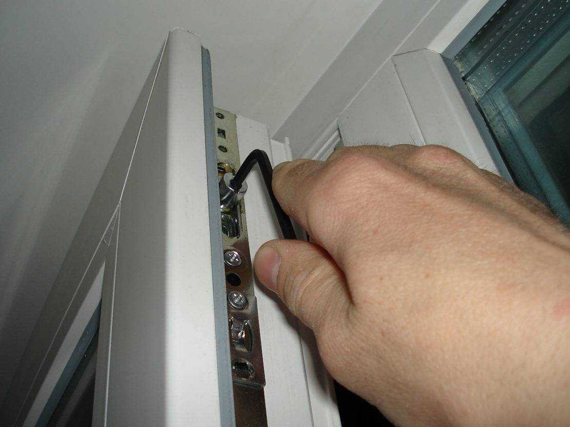 При ослаблении петель или усадке здания возникает произвольное трение створки о раму из-за возникших деформаций. Регулировку начинают с воздействия на верхнюю петлю створки пластикового окна при помощи шестигранника. Он вставляется в винт петли, который расположен под защитным кожухом, и проворачивается по часовой стрелке. Таким образом, противоположный низ будет приподниматься. При вращении против часовой стрелки она будет опускаться.
