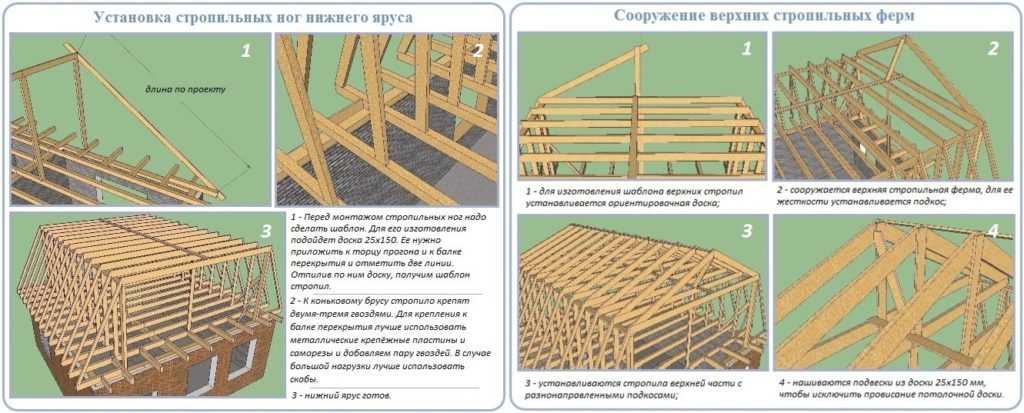 Стропильная система ломаной крыши представляет собой модульную конструкцию, в которой наслонные стропила выполняют функцию нижних скатов крыши, а верхние скаты крыш могут быть выполнены из висячих или наслонных стропил.