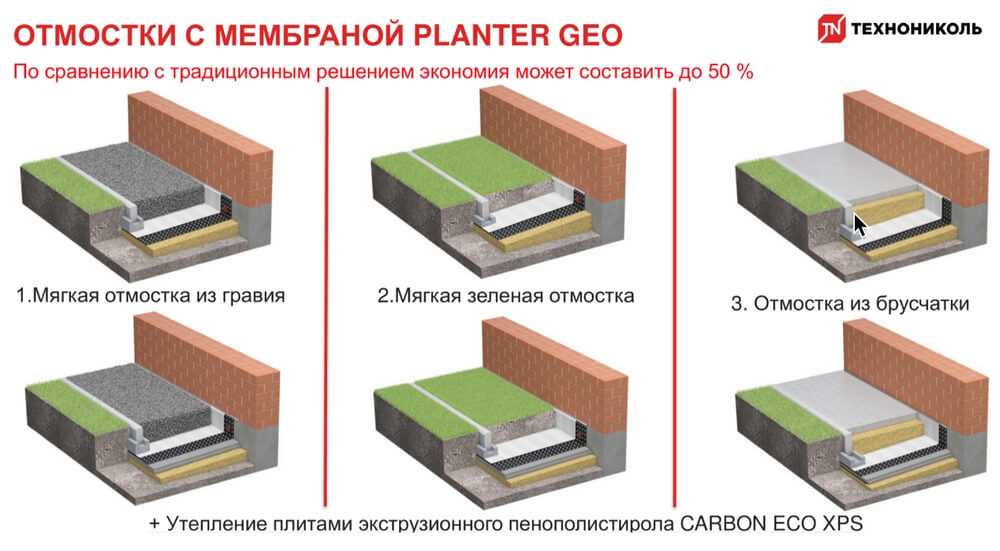 - мягкие – с использованием мембраны PLANTER Geo в основании и покрытием из щебня (гравия), тротуарной плитки или зеленых насаждений. Также мягкие отмостки можно утеплить плитами экструзионного пенополистирола CARBON ECO XPS.