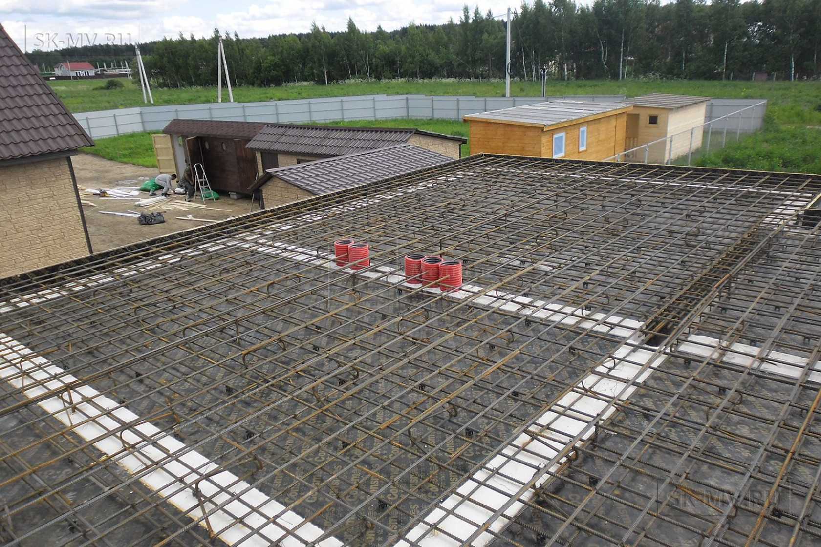 Арматуру укладывают так, чтобы со всех сторон ее закрывал защитный слой бетона не менее 20 мм в толщину. После того, как все составные части будущего перекрытия уложены и надёжно закреплены стойками, начинается заливка бетона.