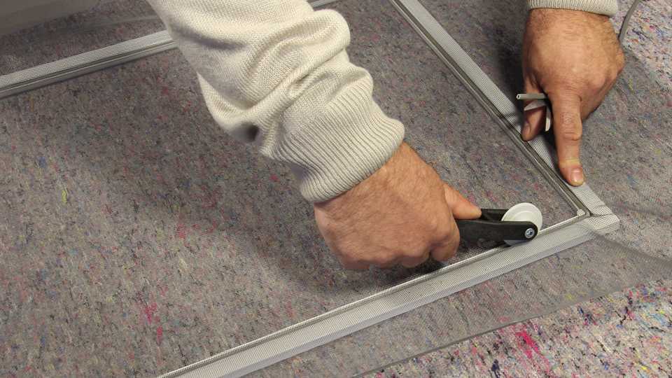 Если рама выполнена из специального профиля, над пазом по полотну кладется шнур и прокатывается роликом до полного вдавливания в паз. Излишки сетки обрезаются, оставляется примерно 1 см (над пазом).