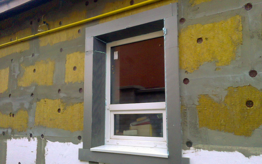 Серьезным недостатком штукатурной отделки оконных откосов снаружи является несовмещение цементной смеси с ПВХ-профилем. Это приводит к формированию щели между оштукатуренными откосами и оконной рамой. Поэтому пространство между оконном профилем и готовым откосом (шпателем формируется небольшая бороздка по периметру) рекомендуется заполнить герметиком на силиконовой основе. Ширина слоя порядка 5 мм.