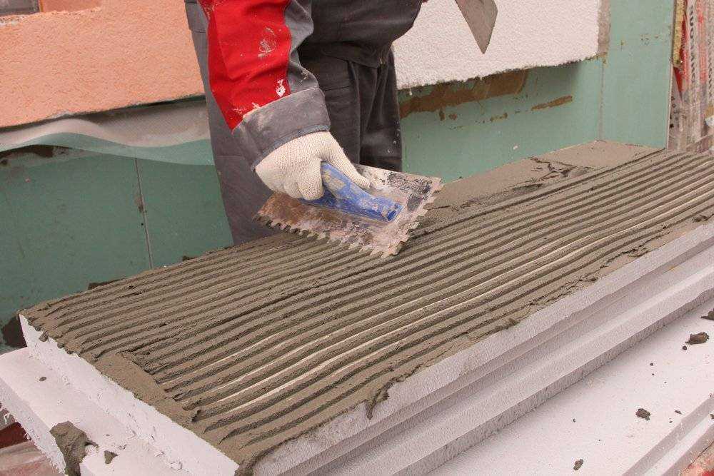 - Наносим на поверхность клей и фиксируем подготовленные детали. Не следует экономить клей, так как между откосами и пенополистиролом могут образоваться пустоты. Лучше удалить излишки состава тряпкой. В процессе приклеивания проверяем правильность установки с помощью уровня. После высыхания клея можно дополнительно закрепить материал при помощи дюбелей. Просверлить отверстия лучше заранее или через пару часов после приклеивания плит. Главное – не допустить смещения пенопласта.