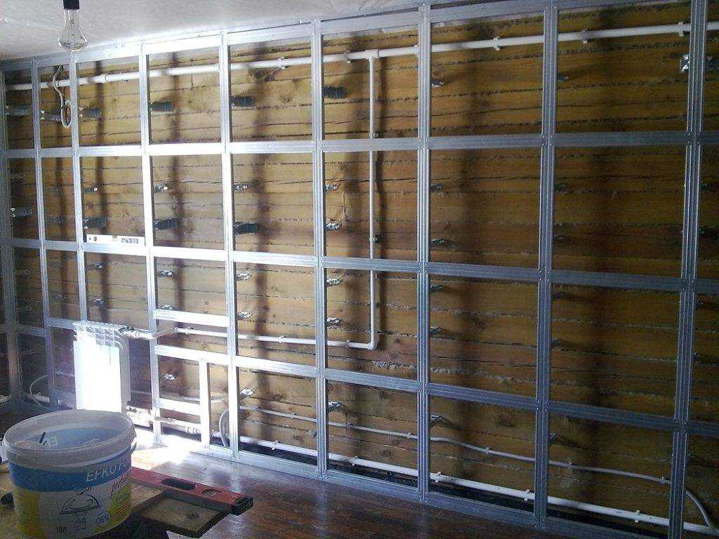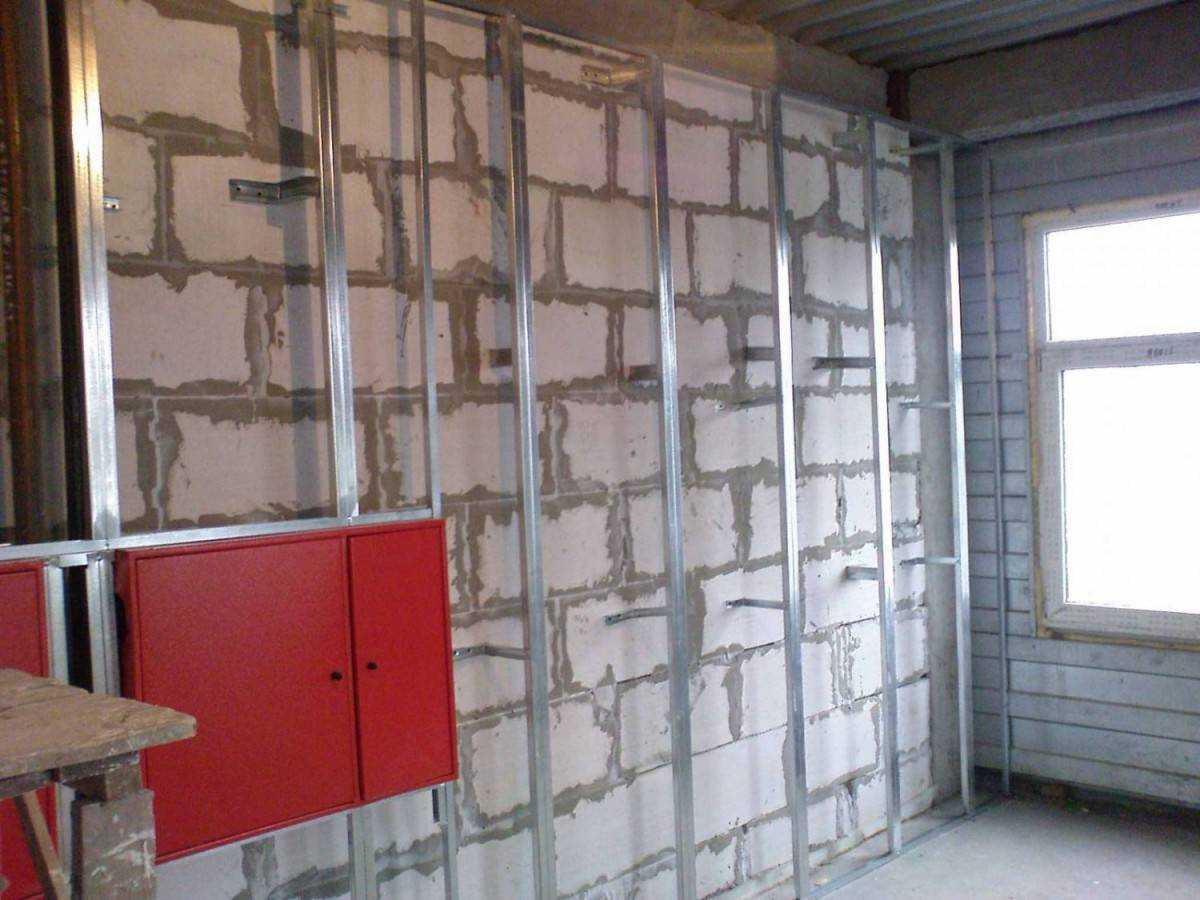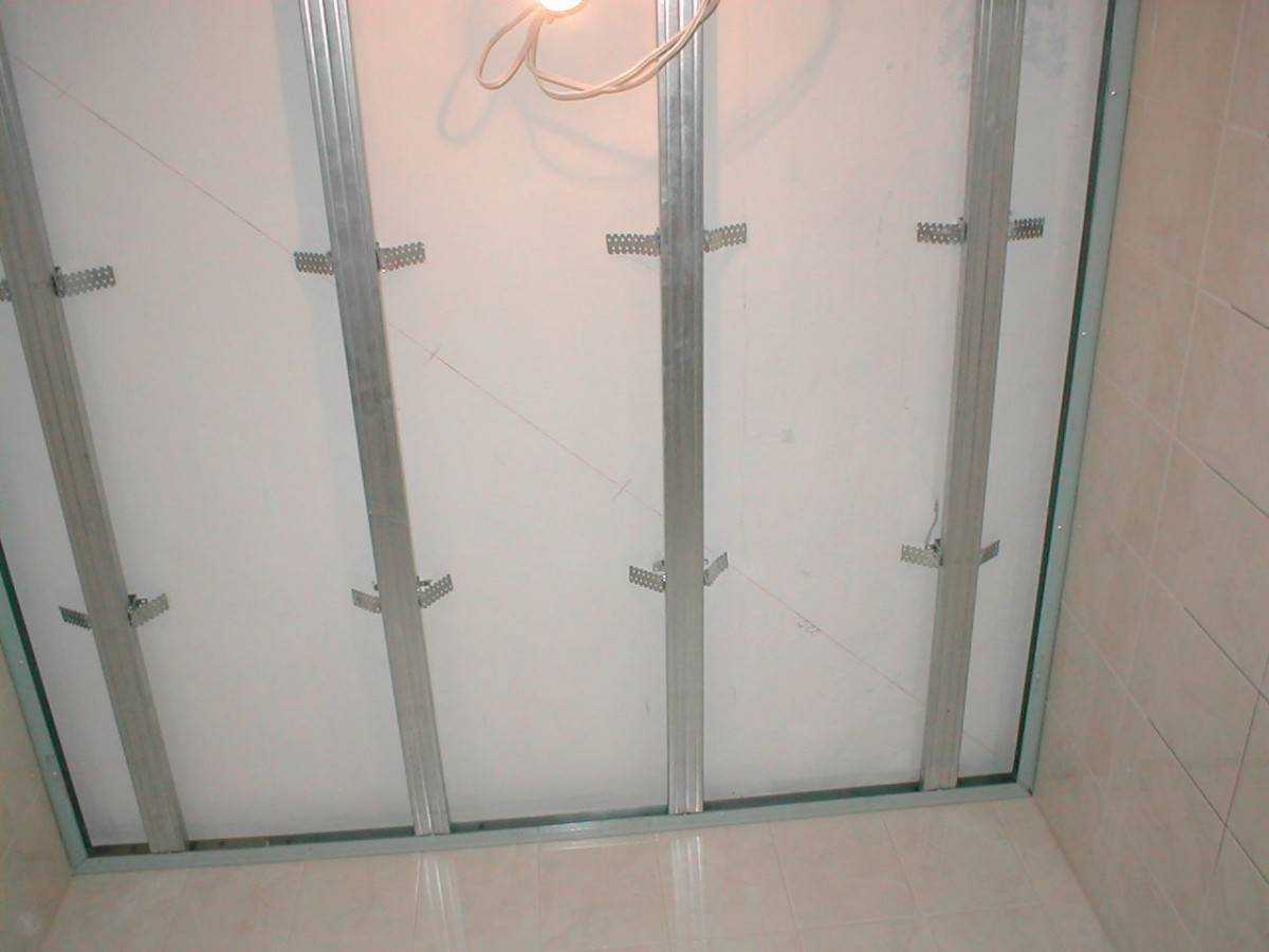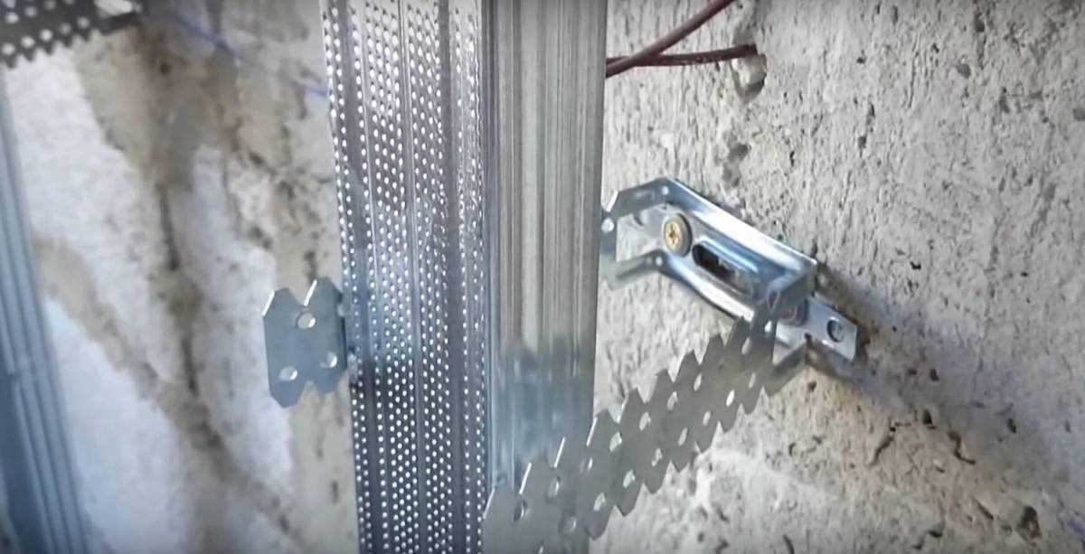 Профили для создания каркасной конструкции на стене имеют определённые размеры и толщину материала. Они покрыты антикоррозийным средством (оцинкованные) – влажность не действует на металлические изделия. Перед тем, как приобретать профили, надо знать их количество из снятых размеров помещения.