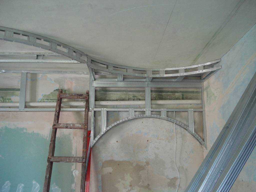 - Арочные профили. По технологическим особенностям этот тип профиля идентичен двум предыдущим видам, однако он имеет усиленную перфорацию с наличием множества отверстий и разрезов. Это дает возможность изгибать его в нужном направлении, формируя каркас сложных конфигураций