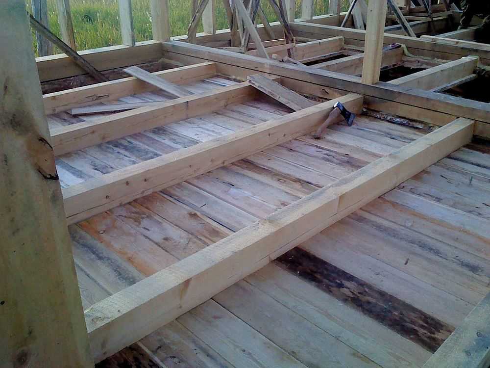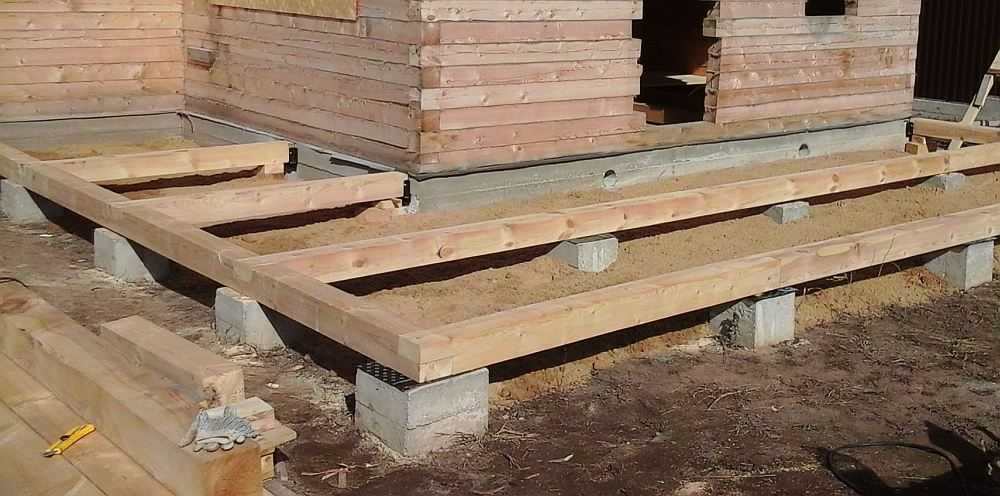 - Деревянный. Устанавливают массивные балки перекрытия сверху гидроизоляции, связывая их с фундаментом анкерами или другими креплениями. Далее на балки набивают лаги, утепляют их, а сверху стелют напольное покрытие.