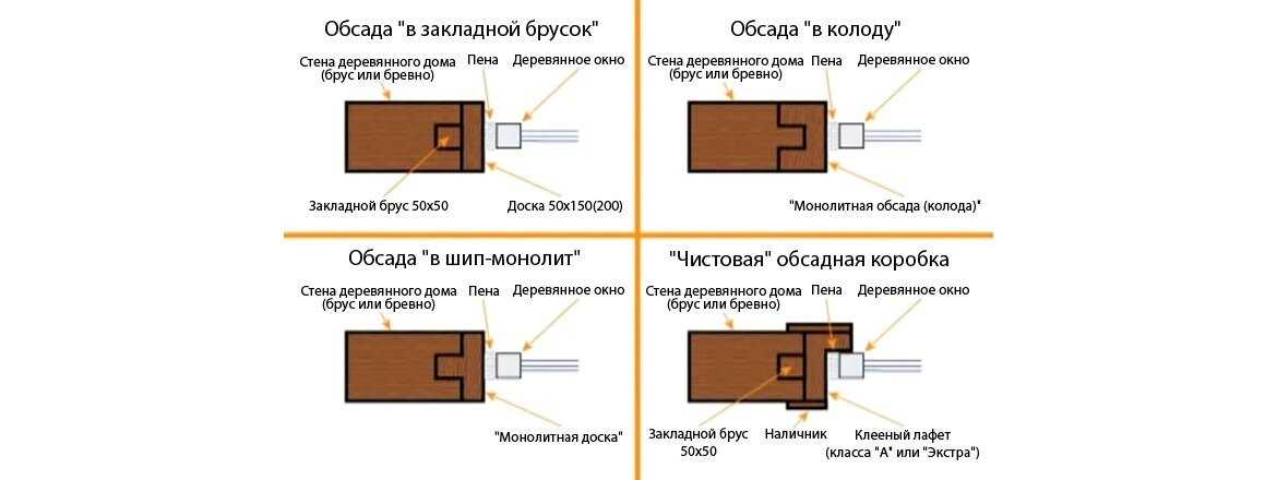 Чтобы встроенное окно не разломалось под весом оседающих брусьев, оконная рама монтируется в еще одной «раме» -«обсаде». На нее возложена задача защищать оконную раму от деформации и поломки.