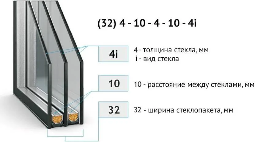 Если в окне две камеры и два энергосберегающих стекла, то выражение принимает следующий вид: 4i -14-4-14-4i. Если камеры заполняются инертным газом, то вы увидите следующую запись: 4i -14Ar-4-14Ar-4i (если использовался аргон Ar).