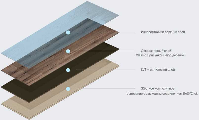 , WPC плитка, , а также кварц винил и LVT — все виды виниловых полов имеют схожую структуру, меняется только наполнение несущего слоя.