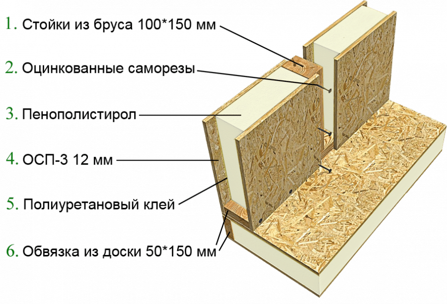 Как правило, сэндвич-панель представляет собой 2 ОСБ плиты и утеплитель между ними. Стены возводимых сооружений получаются достаточно ровными, в т.ч. сама поверхность плит позволяет использовать многие варианты облицовки: