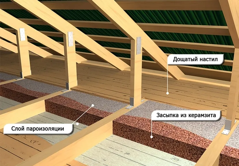 Толщина утеплительного слоя рассчитывается исходя из температурных условий в конкретном регионе. Утеплитель монтируется между лагами или потолочными балками, поверх обустраивается деревянный настил.