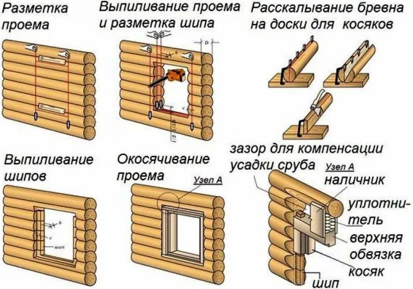 Отверстие в срубе вырезают или цепной. Нижний край оконного проема должен приходиться примерно на середину бревна, если сруб сложен из оцилиндровки. Тут потом будет устанавливаться подоконник.