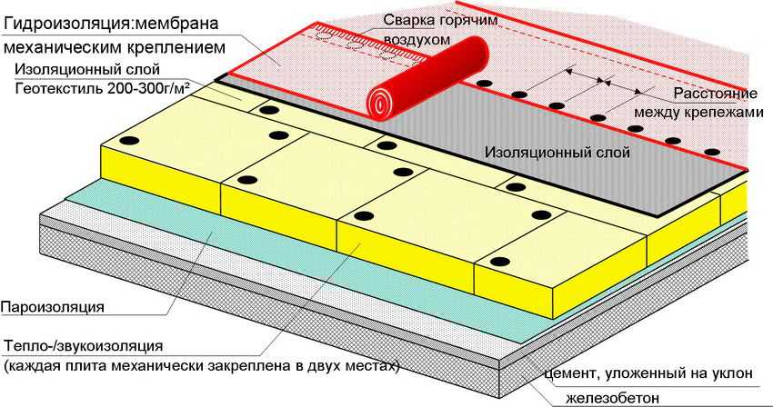 Последовательность слоев кровельной системы с механическим креплением к бетону