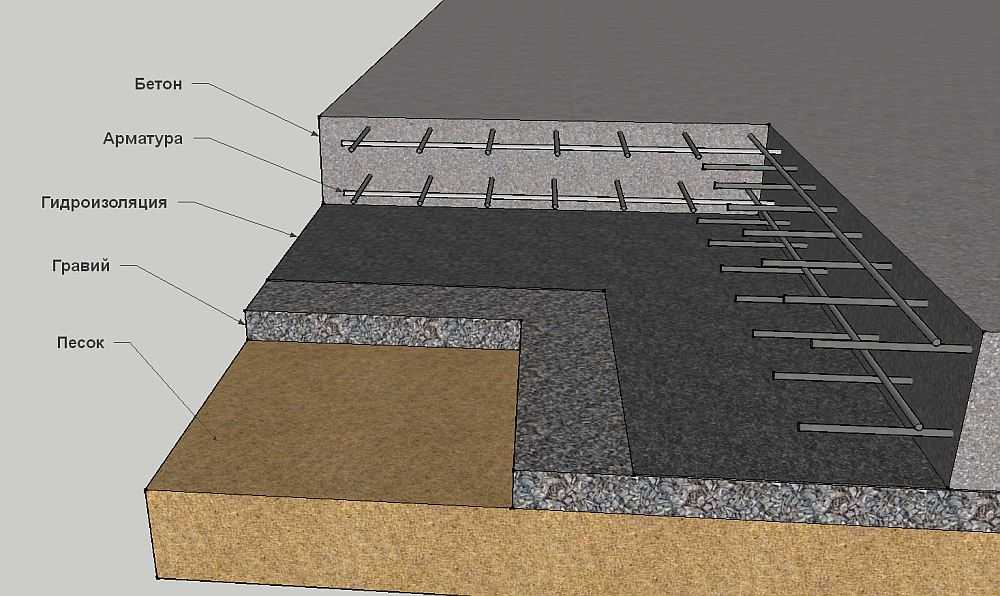 Чтобы основание не подвергалось разрушительному воздействию подземных вод, не пренебрегайте гидроизоляционной «подушкой». Она состоит из двух слоев: песка толщиной 30-40 см и гравия толщиной примерно 20 см. Это позволит предотвратить проникновение капиллярной влаги вглубь монолитного фундамента
