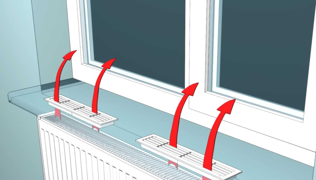 Чтобы изменить положение, нужно заменить широкий подоконник на узкий. Если это сделать невозможно, то в нем делают несколько сквозных отверстий или ставят декоративную решетку прямо в подоконнике.