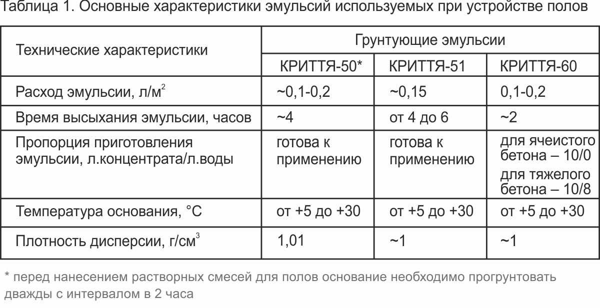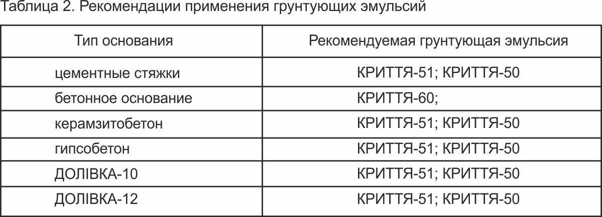 В зависимости от типа основания, при устройстве пола рекомендуется применять грунтующие эмульсии в соответствии с таблицей 2.