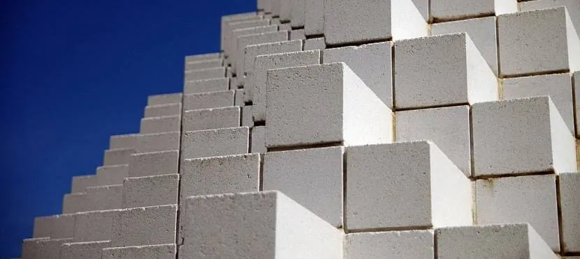 Бетонные блоки из газобетона в современном частном строительстве используются чаще всего. Материал обладает хорошими теплоизоляционными свойствами, но боится влаги, поэтому требует защиты. Бетонный блок стеновой данного типа делают из портландцемента, извести, кварцевого песка, воды и алюминиевой пудры. При прохождении реакции с алюминиевой пудрой появляются пузырьки, которые в процессе термообработки застывают в материале.